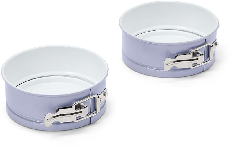 2 mini sütőforma, csatos Szín: Kívül orgonalila Belül krémszínű Anyag: Acél sütőforma, belseje GREBLON® B2 tapadásmentes bevonattal Csat: 18/10-es nemesacél Méretek: Magasság: kb. 5 cm Ø: kb. 12 cm Tartalom: Használati útmutatóval és receptjavaslattal Használati tudnivalók: Mosogatógépben nem tisztítható +230 °C-ig hőmérsékletálló Belül GREBLON® B2 tapadásmentes bevonattal – mérsékli a tészta letapadását, könnyen tisztíthatóKifolyásbiztos, tömören záró aljReceptjavaslattal