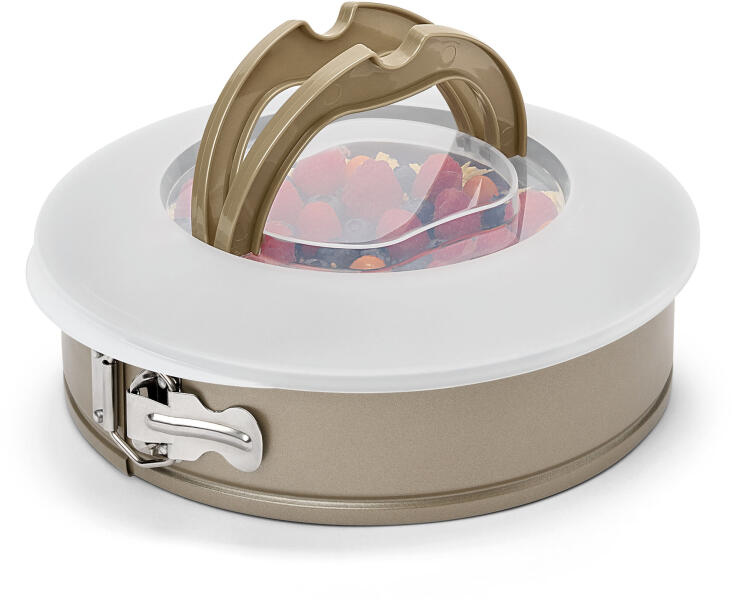 Fedeles sütőforma Szín: Pezsgőarany színű forma és fogantyú Félig áttetsző fedél Anyag: Acéllemez forma PPG QUANTUM bevonat Fedél: 100% polipropilén Csat: 18/10-es nemesacél Méretek: Ø kb. 26 cm Magasság: kb. 6,5 cm Tartalom: Használati útmutatóval, 2 online elérhető recepttel Súly: Kb. 400 g Töltőtömeg: Kb. 2,7 l Figyelmeztetések: A fedél nem használható sütőben Sütéshez, szállításhoz és tároláshozTeljes mértékben PFAS-mentes alapanyagokból készült kiváló tapadásgátló bevonat, csökkenti a tészta letapadását, könnyen tisztíthatóHordozófüles fedél2 online elérhető receptajánlattal